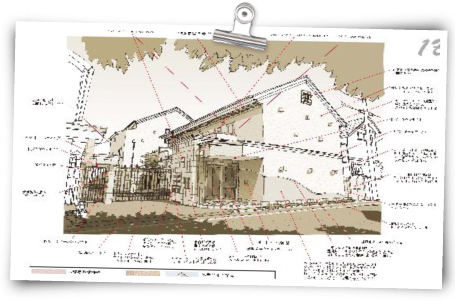 建物全体コンセプトや外観や玄関といった各部位まで、手描きの資料を使って分かりやすく説明をします。